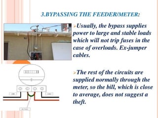 This document summarizes a seminar presentation on a microcontroller-based power theft identification system. It introduces power theft as the illegal use of electrical power without paying the supplier. It then describes two common ways that power theft occurs: slowing down electricity meters with magnets, and inverting meters to make them count backwards. The proposed system architecture integrates a wireless network with the electrical grid to monitor multiple points using data aggregation algorithms. A microcontroller like a PLC would be programmed to detect theft and control the electrical distribution in response.