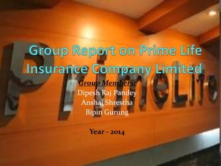 The document is a project report detailing the operations and offerings of Prime Life Insurance Company Limited in Nepal, acknowledging the support of its teacher and relevant stakeholders. It outlines Prime Life's corporate governance, values, insurance products, claim settlement processes, and marketing strategies, highlighting its rapid growth since its establishment in 2007. Additionally, it discusses factors affecting life insurance premiums and the company's commitment to high standards of service and ethical conduct.