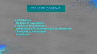 - The meaning and objectives of privatization which includes increasing efficiency and competitiveness while reducing fiscal burden.