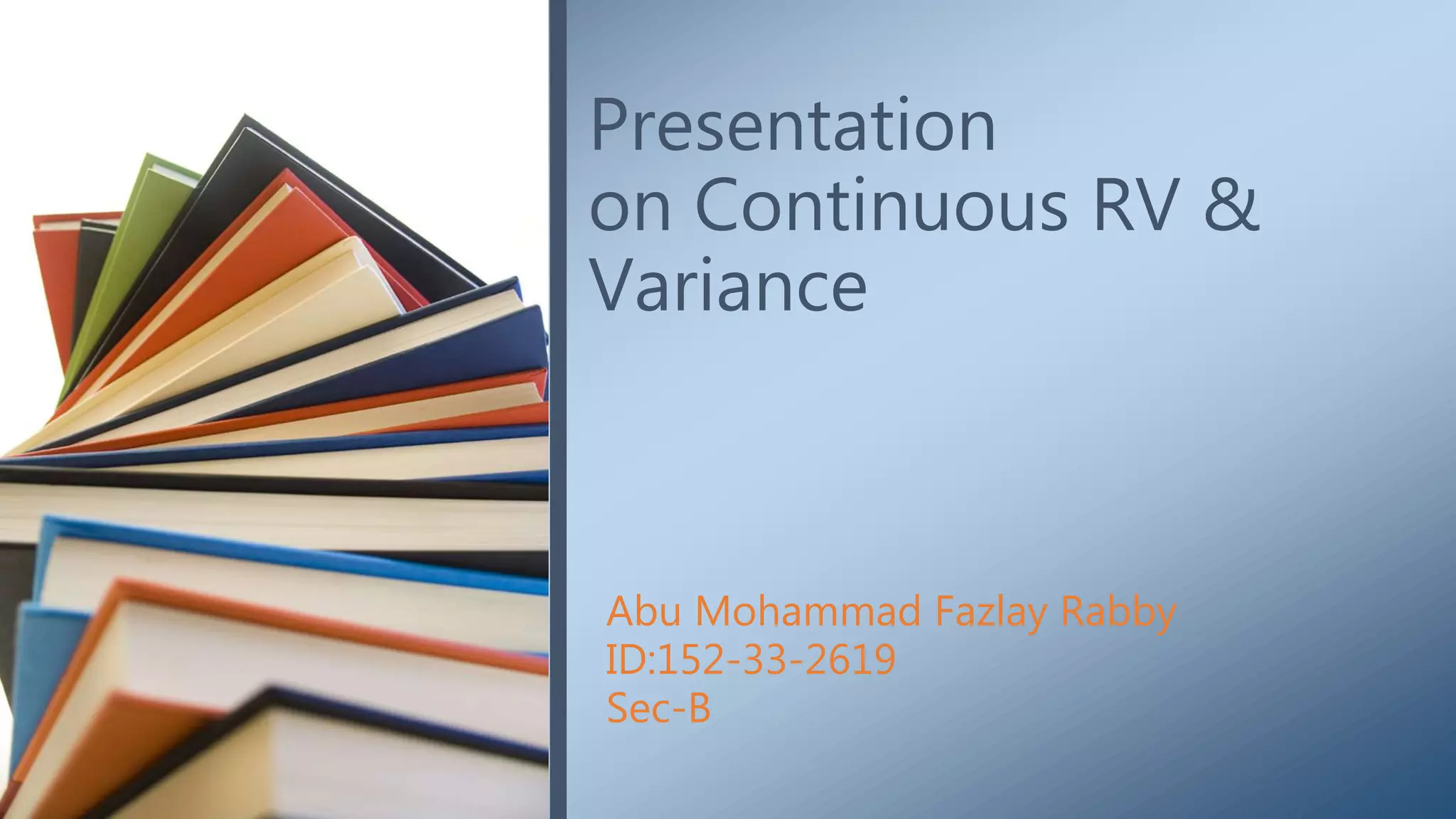 This document provides a presentation on continuous random variables and variance. It discusses continuous random variables as having a range of real numbers and using a probability density function to determine probabilities from areas under the function. Variance is introduced as a topic without definition. The presentation concludes with thanks to the audience.