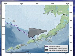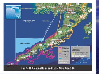 The document discusses the ecological and economic importance of Bristol Bay and the North Aleutian Basin, highlighting its vital fisheries and marine habitat worth over $2 billion annually. It outlines the detrimental impacts of proposed offshore drilling, including risks of oil spills, pollution, and habitat destruction which could severely affect local fisheries and ecosystems. The document advocates for action against offshore drilling and encourages public engagement to protect this unique environment.