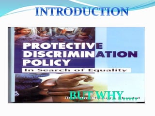 This document discusses protective discrimination and vulnerable groups in Indian society. It defines protective discrimination as granting special privileges to disadvantaged groups. It outlines constitutional safeguards for Scheduled Castes, Scheduled Tribes, women, children and transgender people. It discusses the vulnerable position of these groups and legal provisions meant to protect and advance them such as reservation policies and anti-discrimination laws. The document emphasizes that while these groups want equal respect and participation, current inequalities mean protective discrimination is still needed.