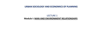 This document provides an overview of urban sociology and the economics of planning. It discusses the relationship between humans and the environment, and how humans impact the environment through overpopulation, pollution, fossil fuel use, and deforestation. It also examines social change in Indian society through various frameworks proposed by M.N. Srinivas, including sanskritization, westernization, modernization, industrialization, and globalization. Each of these processes contributed to changes in Indian villages, tribes, agriculture, industry, and cities over time.