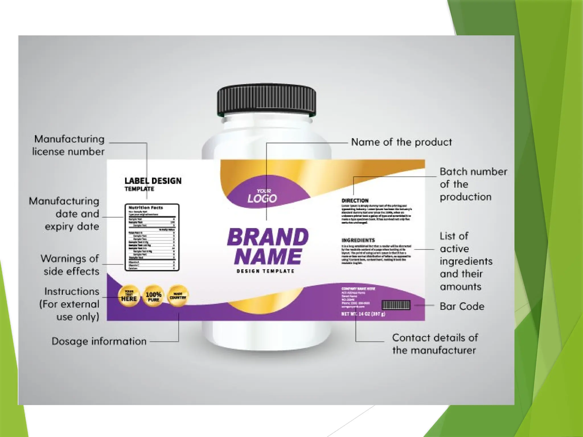 The document outlines principles and recommendations for the design and labeling of product containers and cartons to promote safe medication dispensing and administration. It emphasizes the importance of clear, legible labels to prevent medication errors and includes specific considerations regarding product strength, route of administration, and labeling for special packaging. Various design elements, like text size, color contrast, and avoiding confusing abbreviations, are critical for ensuring that critical safety information is effectively communicated.