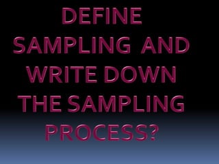 This document discusses sampling in research. It defines sampling as selecting a subset of a population to study and generalize findings to the larger group. Key terms are defined, like population, target population, sample, and sampling frame. The purposes of sampling are described as making research more economical, improving data quality, allowing for quicker study results, and increasing precision and accuracy. Characteristics of a good sample and factors influencing the sampling process are also outlined. In conclusion, sampling is an important part of research that aims to select a representative portion of a population to study.