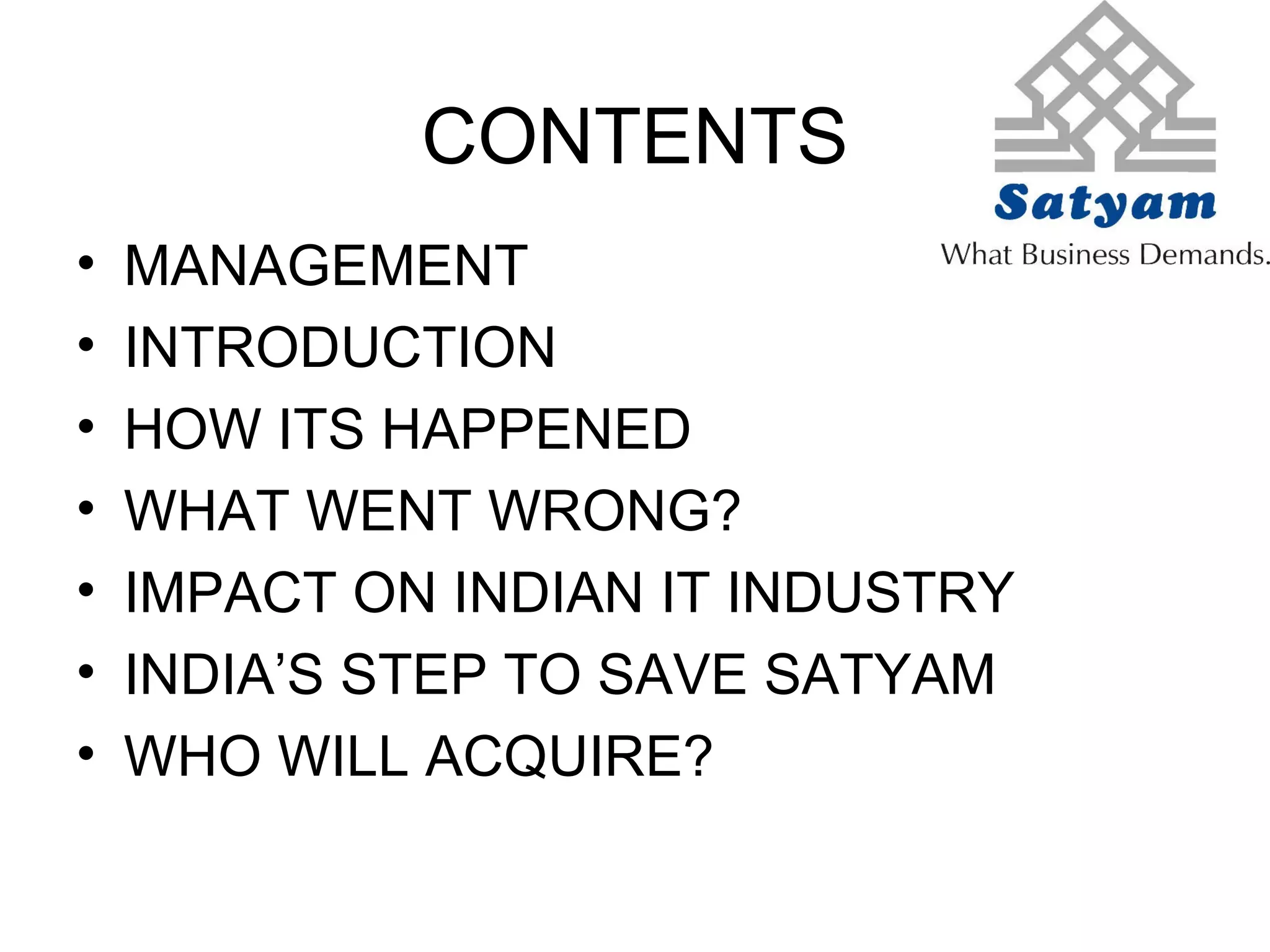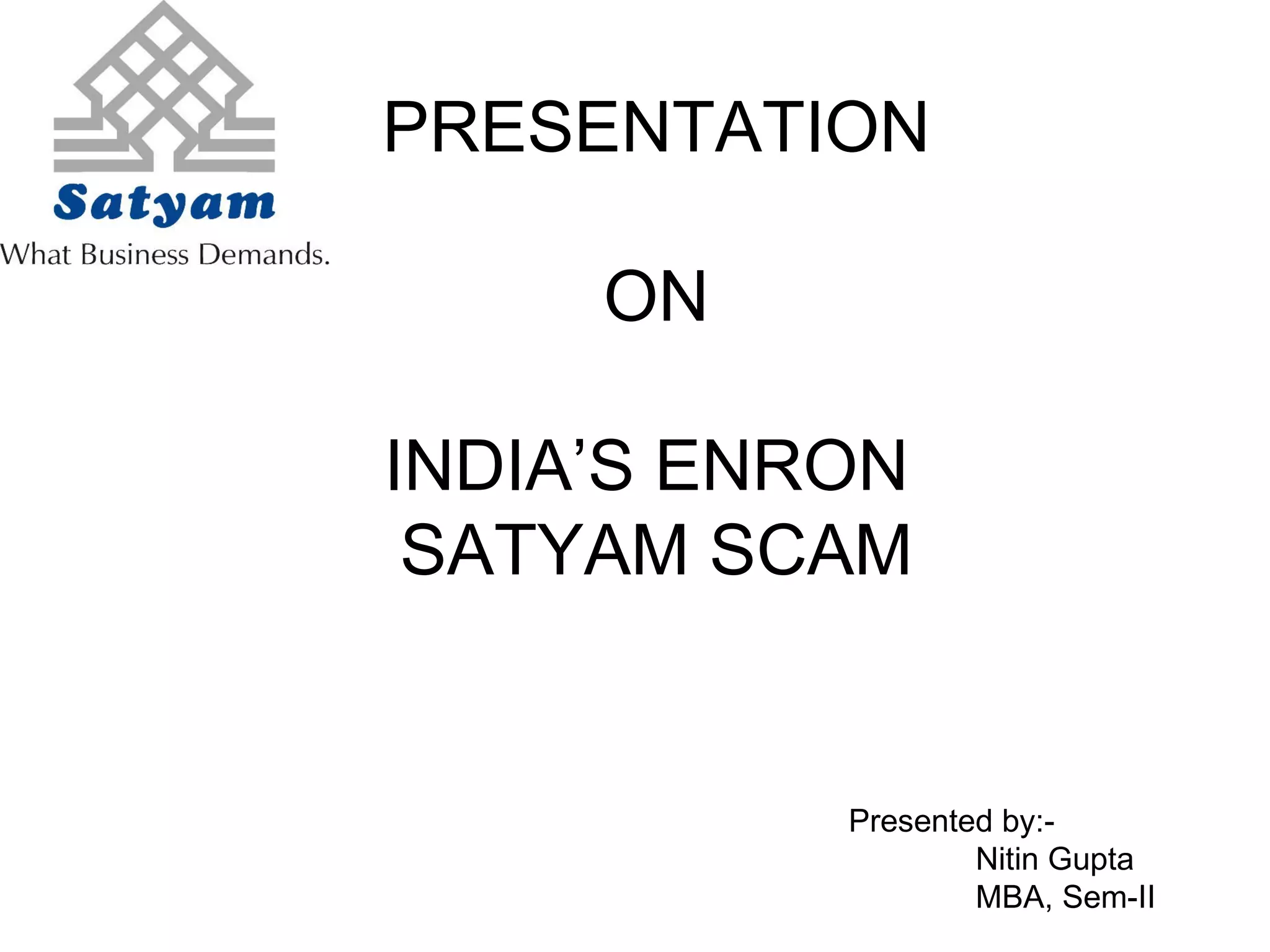 The document presents information on the Satyam scam, one of India's largest corporate frauds. It discusses how Satyam's chairman inflated cash balances and profits in financial statements. This led to the resignation of board members and the chairman admitting to the fraud. The fraud impacted perceptions of Indian IT companies and the stock market. The Indian government took steps to save Satyam by appointing a new board and facilitating loans to cover operating costs, while potential acquirers were being sought.