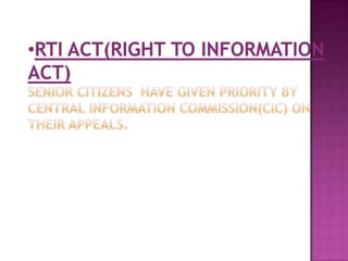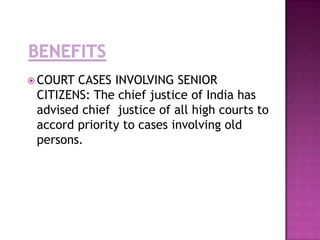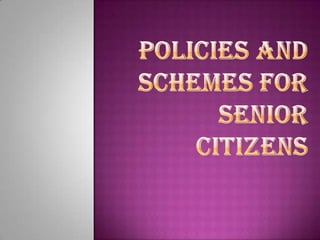 The document summarizes various policies, programs, and provisions in India aimed at supporting senior citizens. It outlines priority given to senior citizens' cases in courts, separate queues for seniors in hospitals, special clinics for seniors in Delhi hospitals, tax benefits for investments and savings schemes for seniors, higher interest rates on savings for seniors, priority for telephone connections for seniors, discounts on phone and transport for seniors, concessions on rail and air travel for seniors, welfare laws and policies for seniors, social security programs, healthcare provisions and facilities for seniors, and initiatives by NGOs to support seniors.