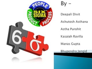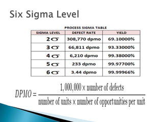 Six Sigma is a set of tools and strategies developed by Motorola in 1986 to improve quality by reducing defects. It aims for nearly flawless processes, with 99.99966% of products free of defects. Six Sigma follows the DMAIC model - Define, Measure, Analyze, Improve, Control - to first define goals, measure current performance, analyze root causes of defects, improve the process, and control future performance. Many companies have successfully adopted Six Sigma and seen benefits like sustained success, enhanced customer value, and accelerated improvement rates.