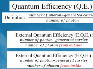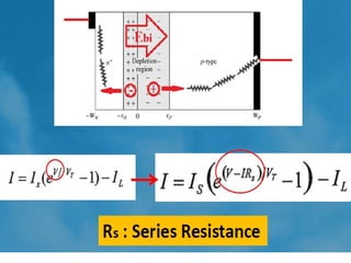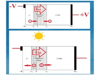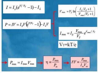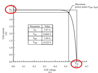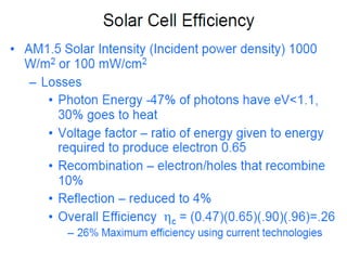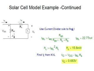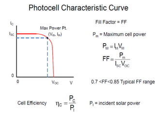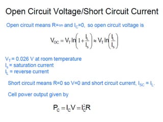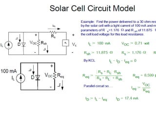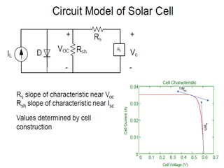 Solar cells directly convert sunlight into electricity through the photovoltaic effect in semiconductor materials like silicon, with solar panels consisting of multiple interconnected solar cells to produce a usable amount of power. The document discusses the basic physics of how silicon is doped to create either holes or electrons that form pairs when struck by photons, as well as explaining the components and operation of single solar cells and larger solar panels.