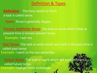This document defines and describes the different types of tenses in English grammar. It discusses 12 tenses: present indefinite, present continuous, present perfect, present perfect continuous, past indefinite, past continuous, past perfect, past perfect continuous, future indefinite, future continuous, future perfect, and future perfect continuous. For each tense, it provides the structure, example sentences, and an explanation of when and how that tense is used. The document is intended to teach students the key aspects and uses of verb tenses in the English language.