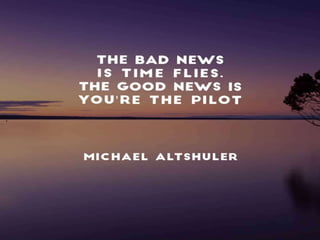 This document outlines a training program on time management. The objectives are to understand the nature and importance of time management, identify daily obstacles, and learn time management techniques and tools. Some common time wasters are listed such as procrastination, perfectionism, and overwork. Tools for effective time management that are described include the Pareto principle, Eisenhower technique, pickle jar theory, and RAC method. The goals of improved time management are increased productivity and performance.