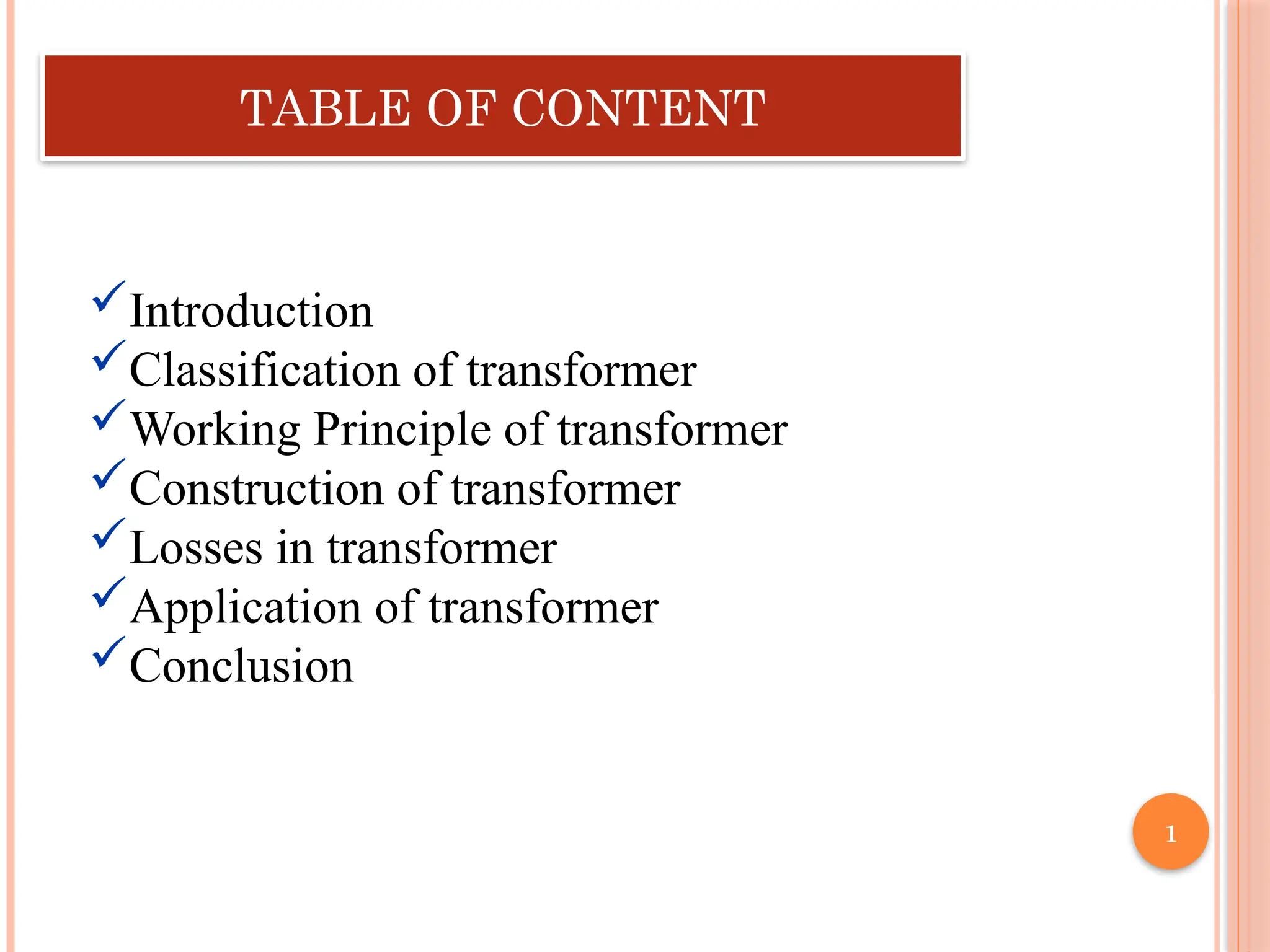 The document presents an overview of transformers, detailing their function as static devices that transfer electrical energy between AC circuits while changing voltage levels without altering frequency. Key sections include the classification of transformers, their working principle based on mutual inductance, construction components, types of losses experienced, and applications in power distribution. The conclusion emphasizes transformers' crucial role in modifying voltage levels within electric circuits.