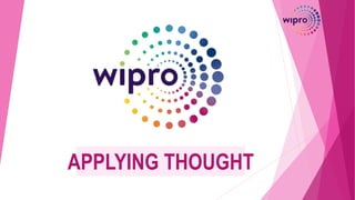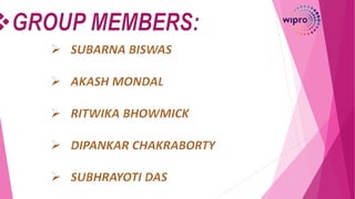 The document provides information about Wipro and its corporate social responsibility initiatives. It discusses Wipro's history starting from 1945 in India and its expansion globally. It then summarizes Wipro's products, services, financial performance, job opportunities, selection process, salary and benefits. The document also gives an overview of Wipro's CSR programs called Wipro Cares which focuses on education and disaster relief, and Eco-Eye which aims to promote various environmental protection initiatives.
