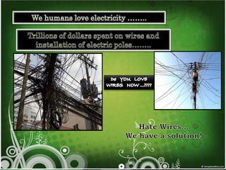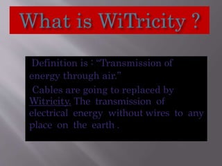 This document discusses wireless electricity or "witricity", where electrical energy is transmitted through air without wires. It begins by defining witricity and explaining that cables will be replaced. There are several reasons for needing wireless electricity, such as the demand for power everywhere and more eco-friendly options. The document then covers the different techniques for wireless energy transfer including short range inductive coupling, mid-range resonant inductive coupling, and long range microwave and laser transmission. It provides examples of applications for both short/mid range and long range wireless power including charging electric vehicles and powering satellites. In conclusion, the document states that wireless electricity is necessary to deal with energy crises, though challenges like costs and interference would need to be