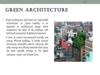 The document discusses green architecture, emphasizing sustainable design that integrates buildings with local ecosystems while utilizing renewable resources. It outlines energy-efficient construction techniques like solar chimneys, wind catchers, and trombe walls, along with features of a specific high-rise project called 'Hues of Life' in Kochi, designed for environmental efficiency. Key highlights include natural ventilation, use of cavity walls, and community spaces, which collectively lower operational costs and enhance living conditions.