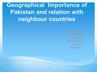 Pakistan is located in South Asia between 24.5° and 37° north latitude and 61° and 77.5° east longitude. It borders India, Afghanistan, Iran and China. Pakistan has a total area of 796,095 km2 and a population of over 200 million people. Its relationships with neighboring countries vary - it has close economic and military ties with China but a more complex relationship with India due to historical conflicts over Kashmir. The Arabian Sea provides important trade routes for Pakistan via ports like Karachi and Gwadar.