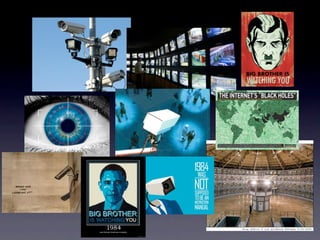 The document discusses the concept of panopticism, originally presented by Jeremy Bentham and later expanded by Michel Foucault, focusing on how visibility and surveillance create power dynamics in society. It explores the implications of control, discipline, and knowledge in various institutions, illustrating how individuals are shaped by these mechanisms in a biopolitical context. Additionally, it touches on the evolution of digital cultures and the asymmetry of information in decentralized networks, highlighting the transition from disciplinary societies to societies of control.