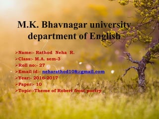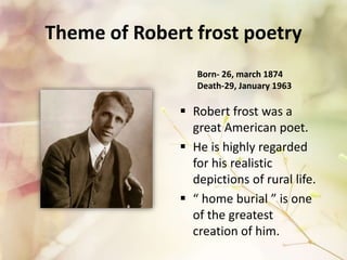 This document discusses the themes in Robert Frost's poetry. It provides biographical information about Frost, lists some of his most famous poems, and analyzes the main themes in his work, including nature, communication, everyday life, isolation, duty, love, and death. The document explains that Frost often depicted rural life and focused on humanity's relationship with the natural world and struggles with communication. It also notes isolation, duty, love, and death as significant recurring themes.
