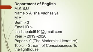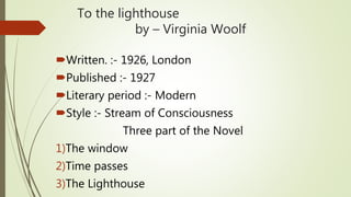 This document provides biographical information about Virginia Woolf and analyzes her use of stream of consciousness in her novel To the Lighthouse. It discusses Woolf as an important modernist author who pioneered the use of stream of consciousness. It then summarizes the plot and characters of To the Lighthouse, and analyzes how Woolf uses techniques like interior monologue and shifting perspectives to represent the characters' inner thoughts and experiences. The document concludes by praising Woolf's skillful use of stream of consciousness to subtly convey the inner worlds of the characters.