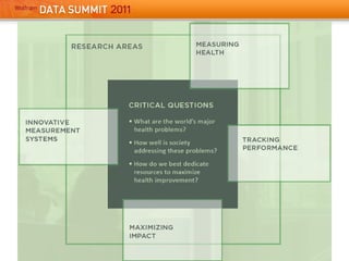 The Institute for Health Metrics and Evaluation is a global health institute that provides scientific measurements and evaluations of population health. It collects various types of health-related data, including social determinants, risks factors, population surveys, and facility data. However, health data is often difficult to access due to issues like privacy, capacity, and a sense of ownership. Health Data Innovation is changing this by encouraging data sharing through open data portals, funding for innovation, and engaging individuals to manage and share their own health data. This enables a virtuous cycle where more data is collected and shared, fueling further innovation and making more timely data available.