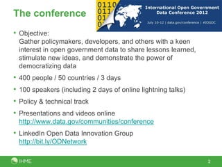 The document summarizes key points from the International Open Government Data Conference. It discusses the objectives of the conference, which was to share lessons learned about open government data and demonstrate its power. It also outlines some of the benefits of open data, such as improving accountability and creating economic opportunities. Finally, it emphasizes that successfully implementing open government data requires focusing on creating an ecosystem around the data through activities like skills training, prototyping, and scaling successful projects.