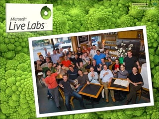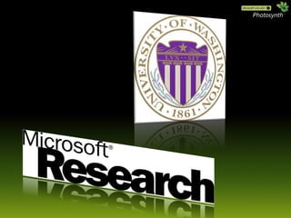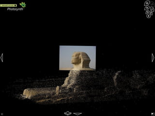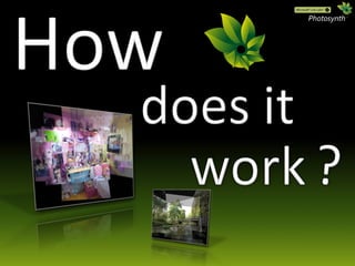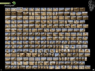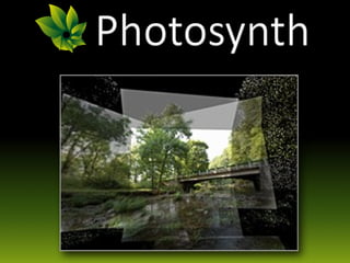 Using computer vision techniques, Photosynth examines images for similarities to reconstruct a 3D model of a space from multiple photos taken of that space. Seadragon technology enables smooth zooming into high-resolution photos without downloading them. Photosynth puts the user in the space like no other by capturing sweeping scale and allowing focus on fine details through synthesis of photos.