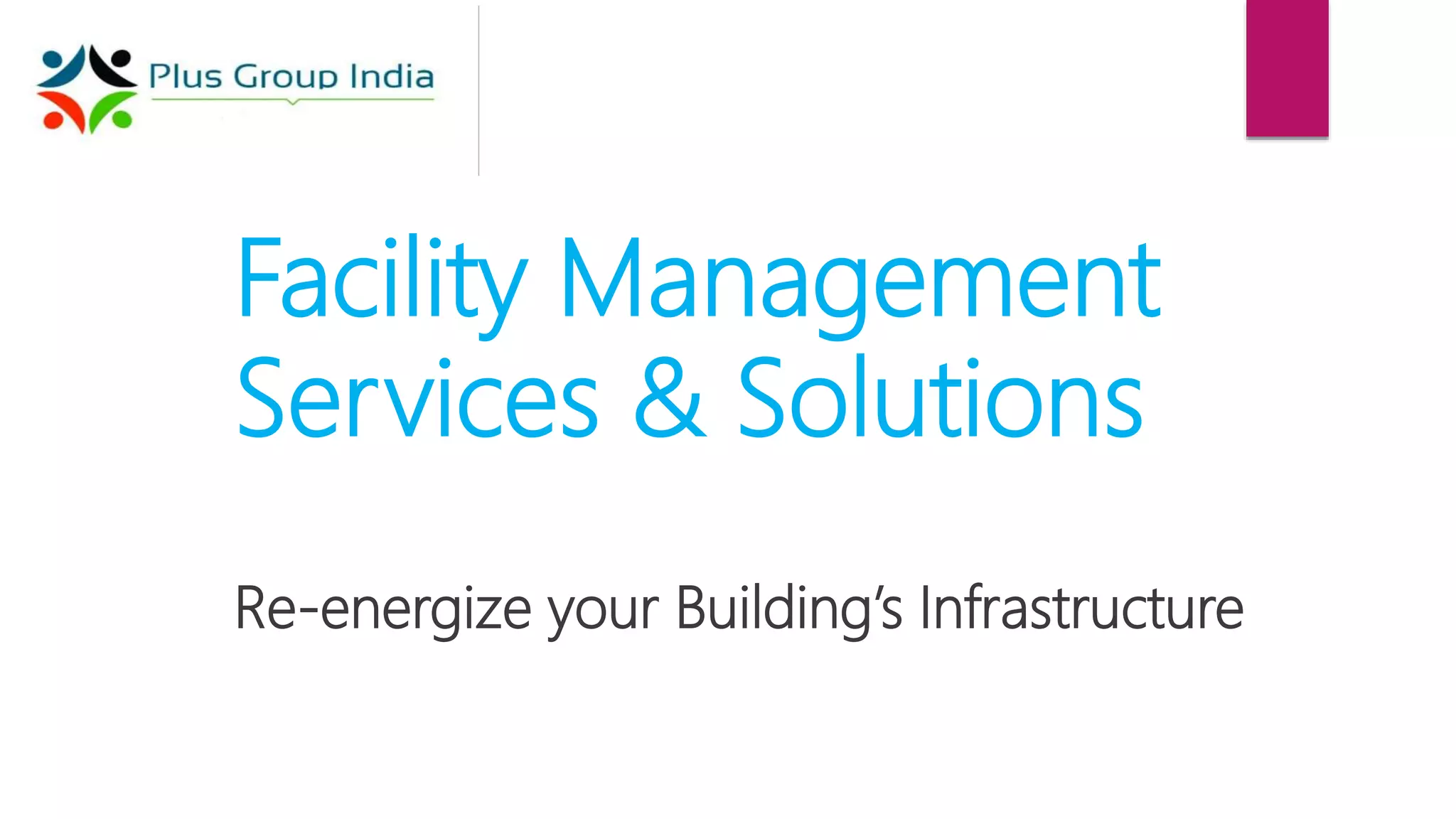 The document discusses facility management services that include building operations and maintenance, electro-mechanical services, pest control, firefighting systems, horticulture, cleaning, and manpower training. It provides an overview of maintenance and operational services for electrical systems, HVAC, generators, plumbing, landscaping, and cleaning of various facility areas. The company aims to re-energize building infrastructure through comprehensive facility management.