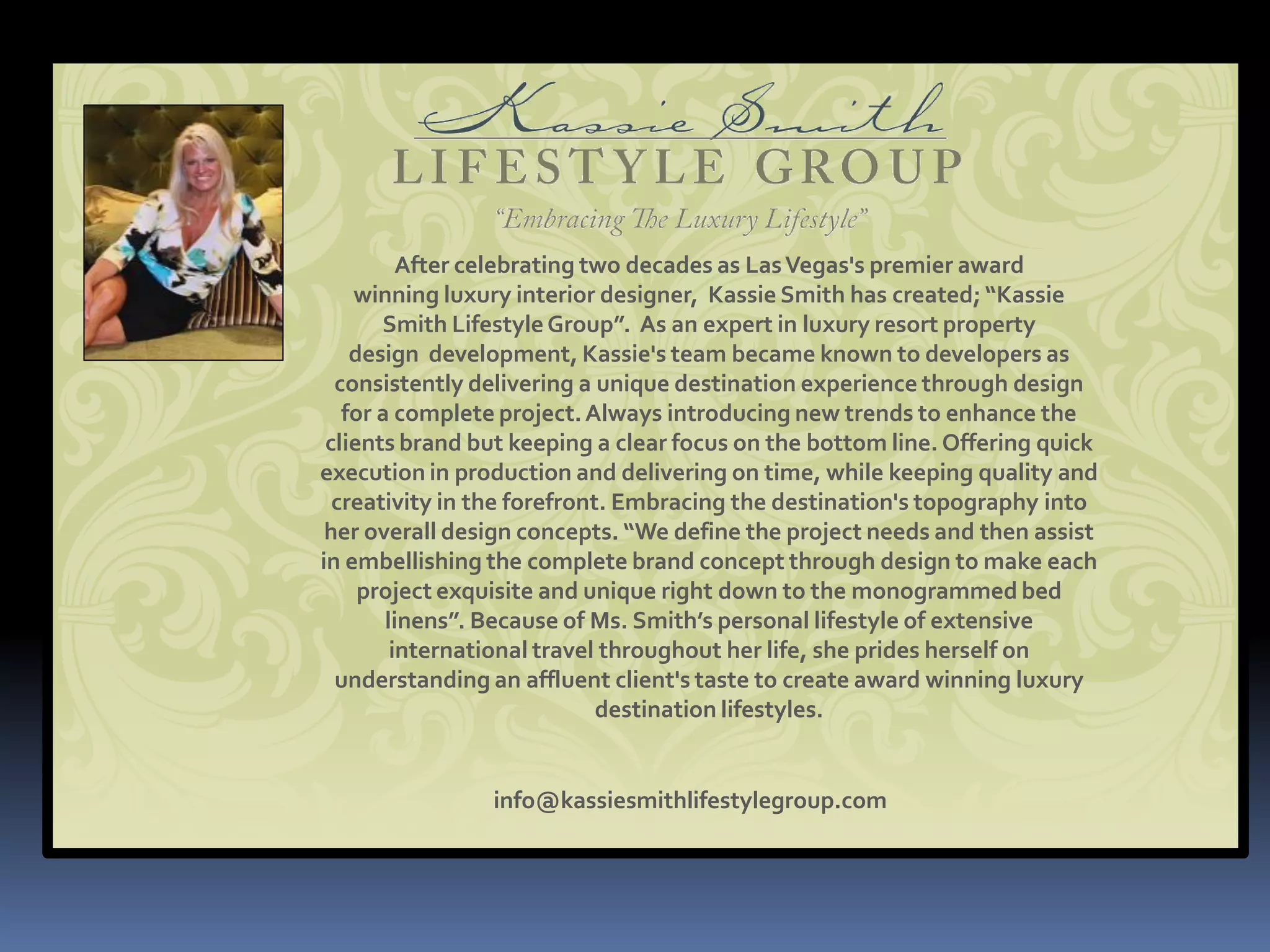 Kassie Smith has over 20 years of experience as a luxury interior designer in Las Vegas. She has created her own company, Kassie Smith Lifestyle Group, to offer design services for resort properties and developments. Her expertise is in complete design development for resorts, including branding, interior design, furnishings, and project management. She works to deliver unique, high-end designs that enhance clients' brands while meeting budgets and timelines. Some of her clients include large developers of resort communities and properties.