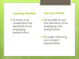 This document provides guidance on how to give an effective oral presentation. It outlines key elements to consider when preparing such as understanding the audience, organizing content into a clear introduction, body and conclusion, and delivering with vocal variation, eye contact and body language. Tips for dealing with nervousness include practicing, being well prepared, slowing down and smiling to appear confident. The overall goal is to inform, inspire or convince the audience through an engaging presentation.
