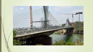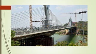 The document discusses cable-stayed bridges, providing information on their components, design considerations, advantages, and analysis methods. It introduces the Midas Civil software for bridge design and analysis. It then discusses the Durgam Cheruvu cable-stayed bridge project in Hyderabad, India, which was proposed to ease traffic congestion. Key components of cable-stayed bridges are described, including pylons, girders, cables, and anchoring systems. Methods of structural analysis for these bridges, including for construction stages, are also summarized.