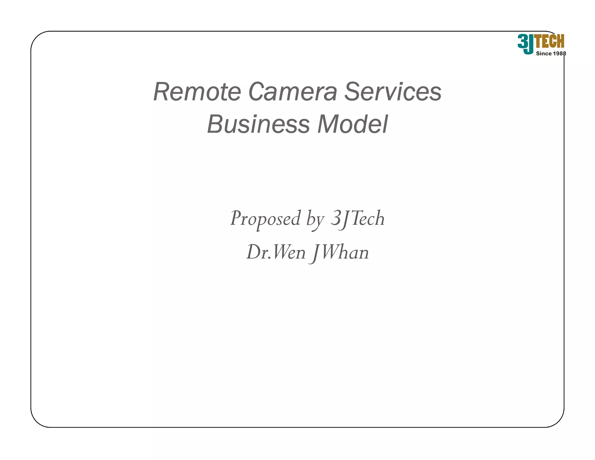 The document outlines a proposed business model for remote camera services by 3jtech, detailing operator roles, tiered customer service, and hardware installations. It describes a scalable remote camera system for monitoring various environmental parameters in residential and commercial buildings. The revenue-sharing model includes licensing fees and hardware deposits to be collected from clients.