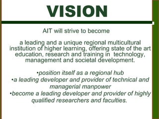 This document provides an overview of the Asian Institute of Technology (AIT) including its vision, mission, characteristics, programs offered, facilities, funding opportunities, and student/faculty demographics. AIT aims to be a leading regional institution offering technical and managerial education with a research focus. It has a diverse international student body and faculty from over 40 countries.