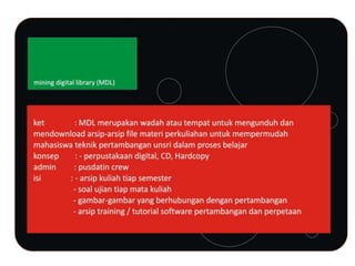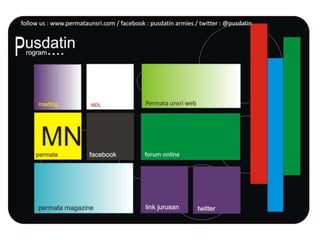 Dokumen tersebut membahas tentang visi Pusat Dokumentasi dan Informasi (PUSDATIN) Universitas Sriwijaya untuk menyediakan berbagai data dan informasi terkait kegiatan mahasiswa, arsip perkuliahan, dunia pertambangan, alumni dan lowongan pekerjaan kepada seluruh mahasiswa melalui tampilan web dan media sosial seperti Facebook.