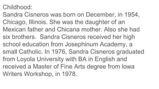 Sandra Cisneros was born in 1954 in Chicago, Illinois. She was raised in a Mexican-American family with six brothers. Cisneros received a BA in English from Loyola University and an MFA from the Iowa Writers' Workshop.