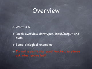 This document provides an introduction to the statistical programming language R. It outlines what R is, how to access and use its interface, and how to work with basic data types like vectors, matrices, and factors. It also demonstrates how to import and export data, perform basic plotting and graphics, and gives examples working with biological data from Affymetrix chips. The presenter encourages attendees to ask questions and notes they are not a perfect teacher.