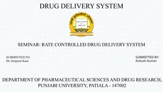 The document discusses various types of drug delivery systems, focusing on rate-controlled drug delivery mechanisms. It contrasts sustained release and controlled release systems, outlines their advantages and disadvantages, and details classifications such as rate-preprogrammed, activation-modulated, feedback-regulated, and site-specific systems. The seminar highlights advancements in drug delivery technology, emphasizing controlled drug release rates and targeting specific tissues for therapeutic benefits.