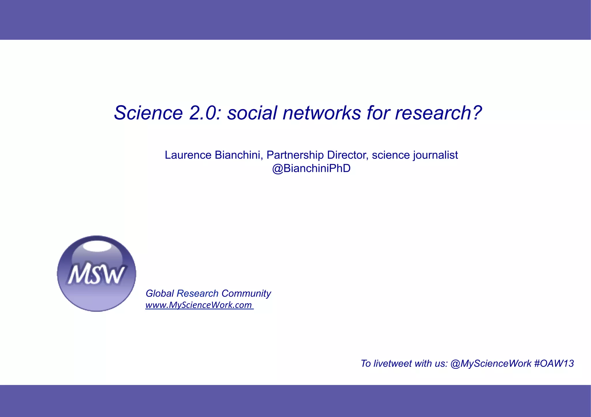The document discusses scientific social networks and how they can help researchers in the current environment of funding cuts and fewer students. It presents MyScienceWork as a centralized platform dedicated to research with a global community, over 28 million open access articles, and tools to help with every step of the research process. MyScienceWork aims to increase efficiency and enable more collaboration and interdisciplinarity through its semantic search and personalized features. Further innovation is planned to advance these goals and move towards more open science.