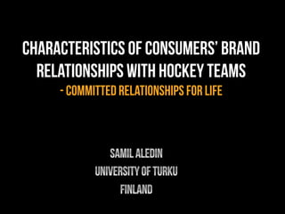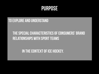 This document analyzes characteristics of consumer relationships with hockey teams based on interviews with male fans ages 29-55. It finds that relationships with hockey teams exhibit lifelong commitment, with fans often disliking rival teams their whole lives. Some relationships began due to coincidence of attending a first game. Relationships involved passion, aggression, and verbal abuse between fans. Fans formed strong bonds with other fans in brand communities at games. Overall, relationships with hockey teams showed stronger, longer-lasting commitment than typical consumer product relationships.