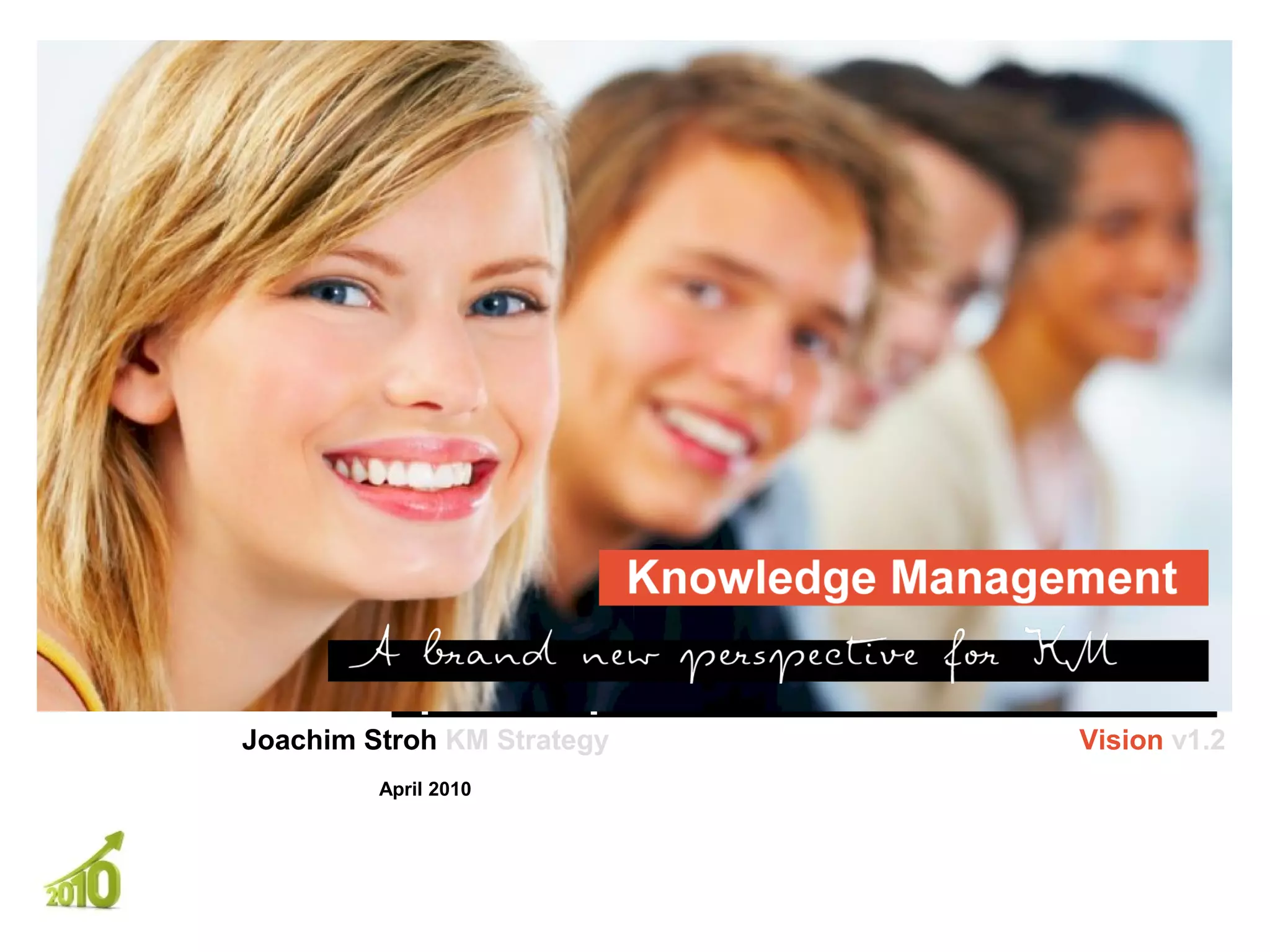 This document discusses knowledge management strategies and visions. It proposes transforming an organization called Vantage into a central place to connect, collaborate, collect, and communicate knowledge by enabling expertise networks, workspaces for client collaboration, improved knowledge collection and dissemination, and integrated content sharing. The goal is to empower associates and instill growth through an enterprise 2.0 framework providing social networking, mobile team collaboration, and systems to engage clients and the business network.