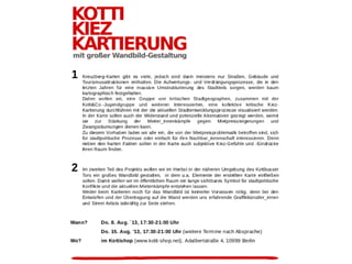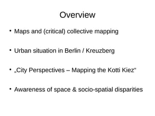 This document describes a project called "City Perspectives - Mapping the Kotti Kiez" which aims to raise awareness of socio-spatial processes and structures among young people in Berlin through collective mapping workshops. The workshops will have participants map their neighborhood and discuss urban development, gentrification, and how maps can represent different perspectives. The collective map created will then be transferred into a mural to symbolize urban struggles in Berlin. The goal is to empower young people by giving them a way to express their views and show they can shape their urban environment.