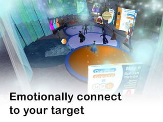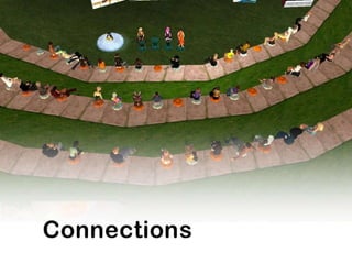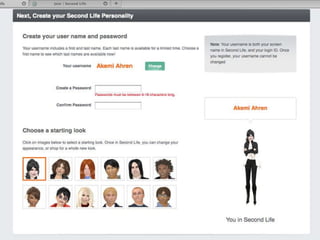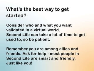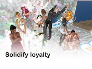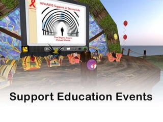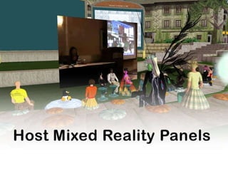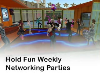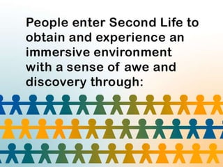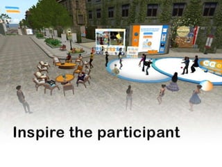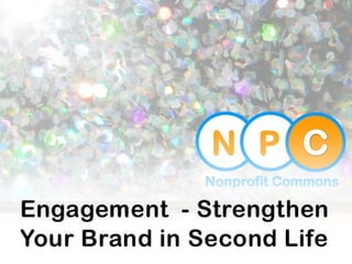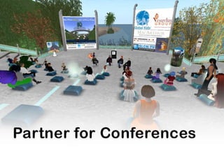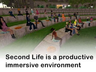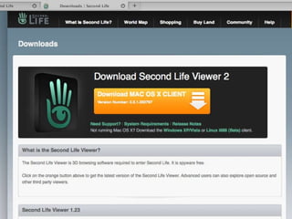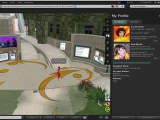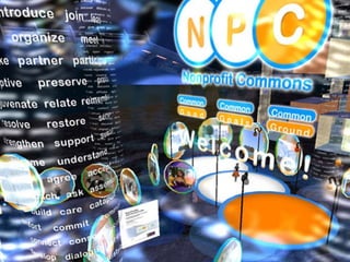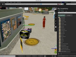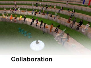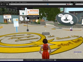The document summarizes a webinar about using Second Life to collaborate and connect. It provides an overview of Second Life, how nonprofits can get started and use it to support their missions. It also discusses the Nonprofit Commons in Second Life which provides free virtual office space and resources to nonprofits. The webinar covered benefits of Second Life, examples of nonprofit use, and future plans such as partnering for health initiatives and serious gaming.