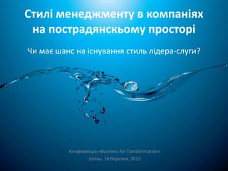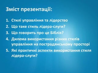 Чи має в таких умовах шанси на існування та ефективне використання лідерство через служіння іншим? В цій презентації зроблена спроба дати відповідь на це питання.