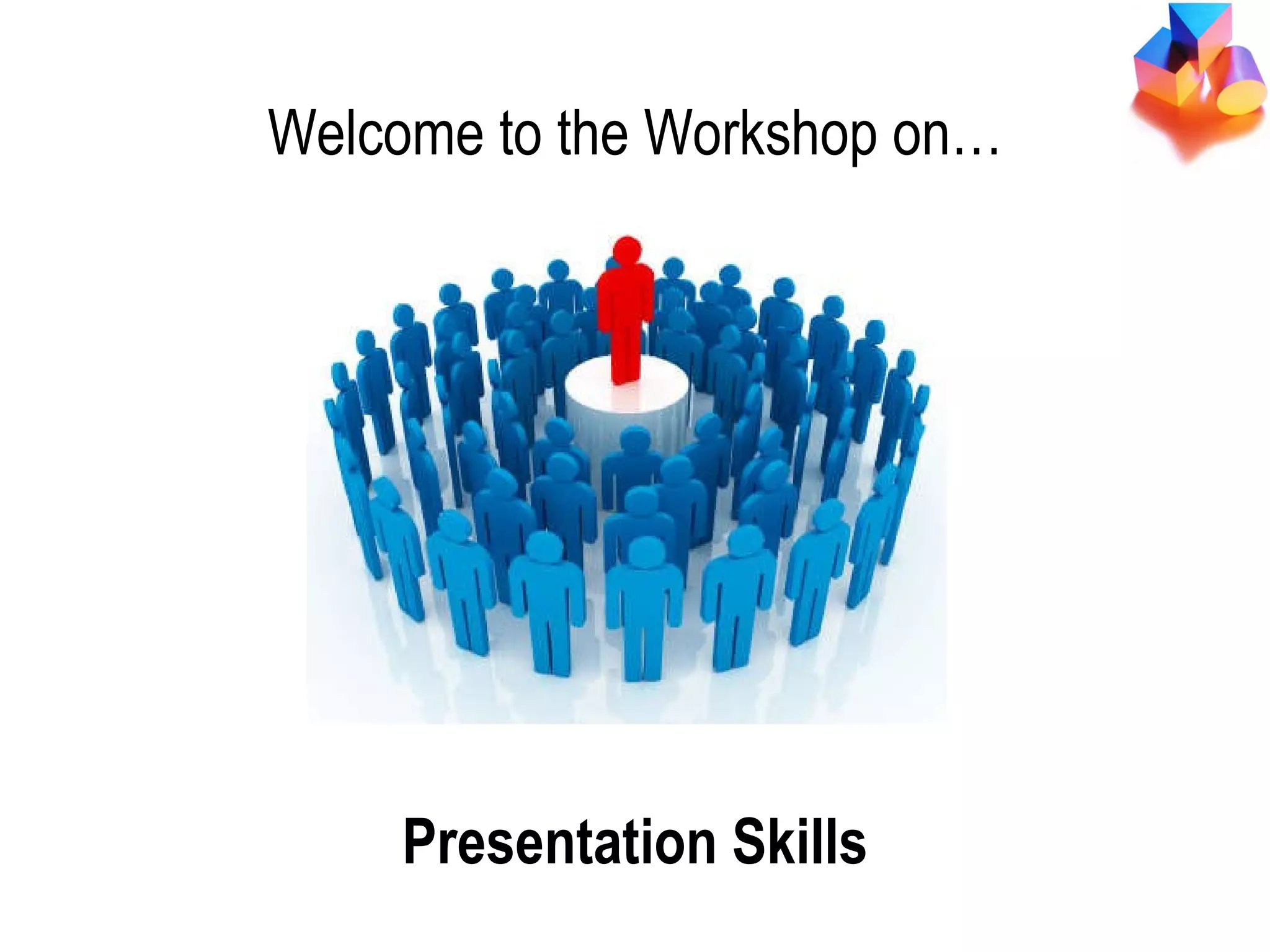 The document provides an overview of a workshop on presentation skills. It discusses introducing oneself, setting expectations, objectives of improving presentation techniques and reducing nerves. It covers key issues like body language, rehearsal tips, ways to begin and structure a presentation, and using visual aids to engage audiences. The goal is to help participants understand the art of giving effective presentations.