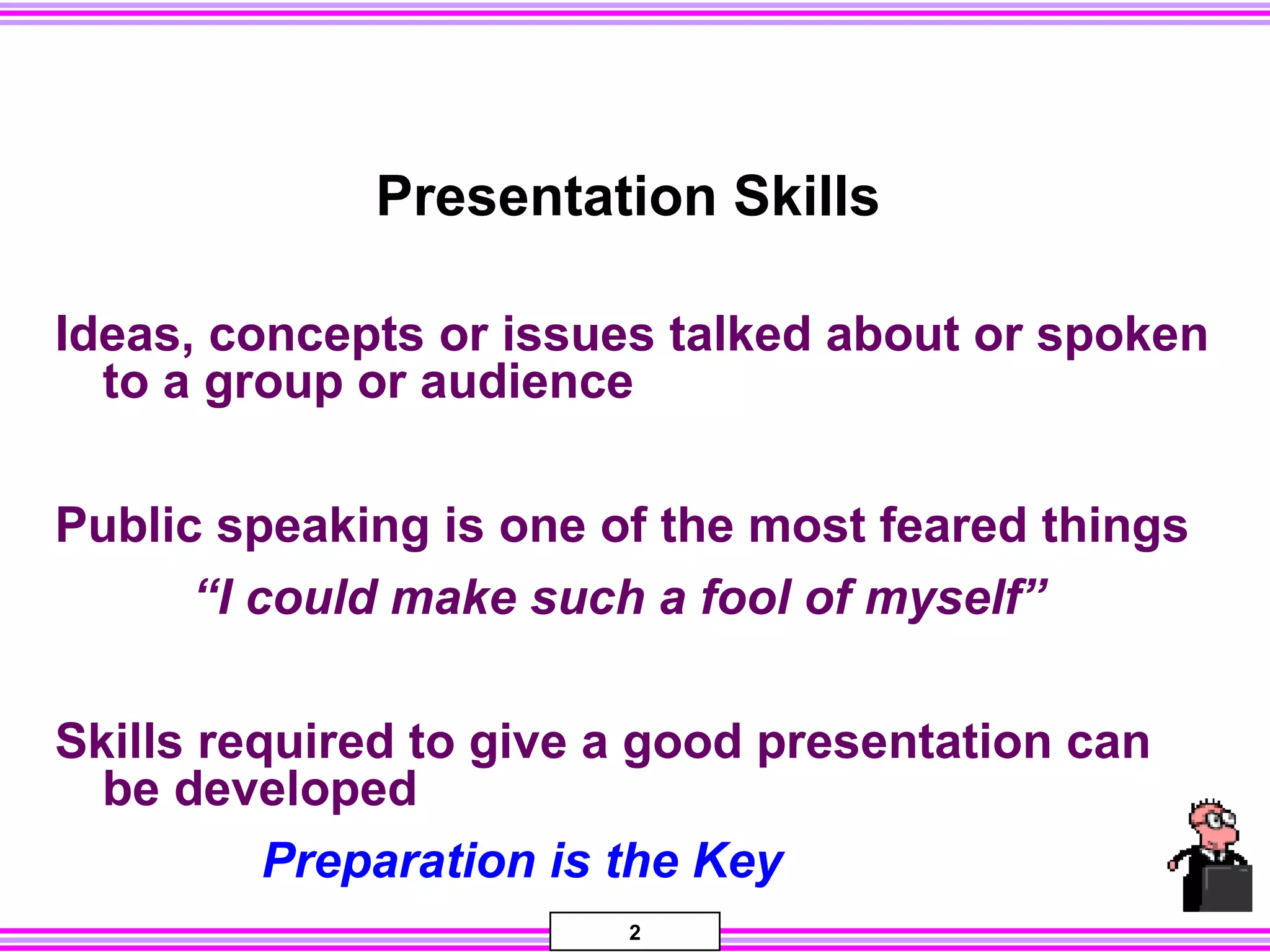 This document provides tips and guidelines for giving effective presentations. It discusses the importance of preparation, organization, and tailoring the presentation to the audience. Key recommendations include having a clear purpose, following the POPTA structure of presenting the purpose, organization, preparation, time constraints, and audience considerations. The document also provides dos and don'ts for creating effective slides and successfully delivering the presentation, including practicing navigation, handling questions from the audience, and remaining relaxed during the presentation. The overall message is that anyone can improve their presentation skills with practice.