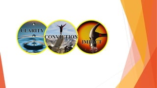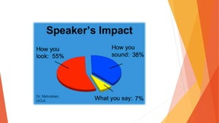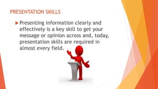 This document provides guidance on developing strong presentation skills. It discusses that presenting information clearly is an important skill across many fields. It also notes that public speaking is one of people's biggest fears. The document then gives tips for effective presentations, such as preparing and practicing, maintaining audience attention for 6-8 minutes, using visual aids appropriately, and following a step-by-step process for creating and delivering presentations. Effective presentation is portrayed as relying on preparation, knowledge, and confidence.