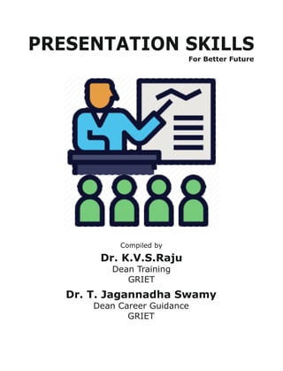 This document provides guidance on developing strong presentation skills. It outlines 14 tips for effective presentations, including mastering the content, practicing extensively, knowing the audience, arriving early to test equipment, thinking positively, making eye contact, using humor, being flexible, being confident, pausing purposefully, engaging the audience, avoiding excuses, studying other presenters, and continuously improving skills over time through hard work. The document was compiled by faculty at Gokaraju Rangaraju Institute of Engineering and Technology to help students develop skills for better career opportunities.