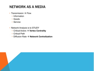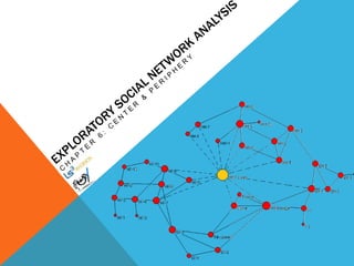 This document discusses different measures of centrality in networks: degree centrality, closeness centrality, and betweenness centrality. Degree centrality is a measure of how connected a node is based on its number of connections. Closeness centrality quantifies how close a node is to all other nodes based on the shortest path distances. Betweenness centrality measures the number of shortest paths that pass through a node, indicating its importance as an intermediary. The document also describes how to calculate centralization measures for networks based on these centrality metrics.