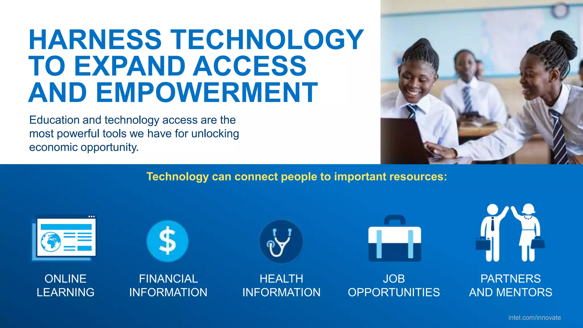The document emphasizes the critical role of technology and education in empowering individuals, particularly women and girls, to access economic opportunities. It highlights statistics on internet accessibility and the impact of education on health and economic growth, showcasing programs aimed at bridging this gap. Intel's initiatives, like the 'She Will Connect' program, aim to enhance digital literacy among women to foster societal change.