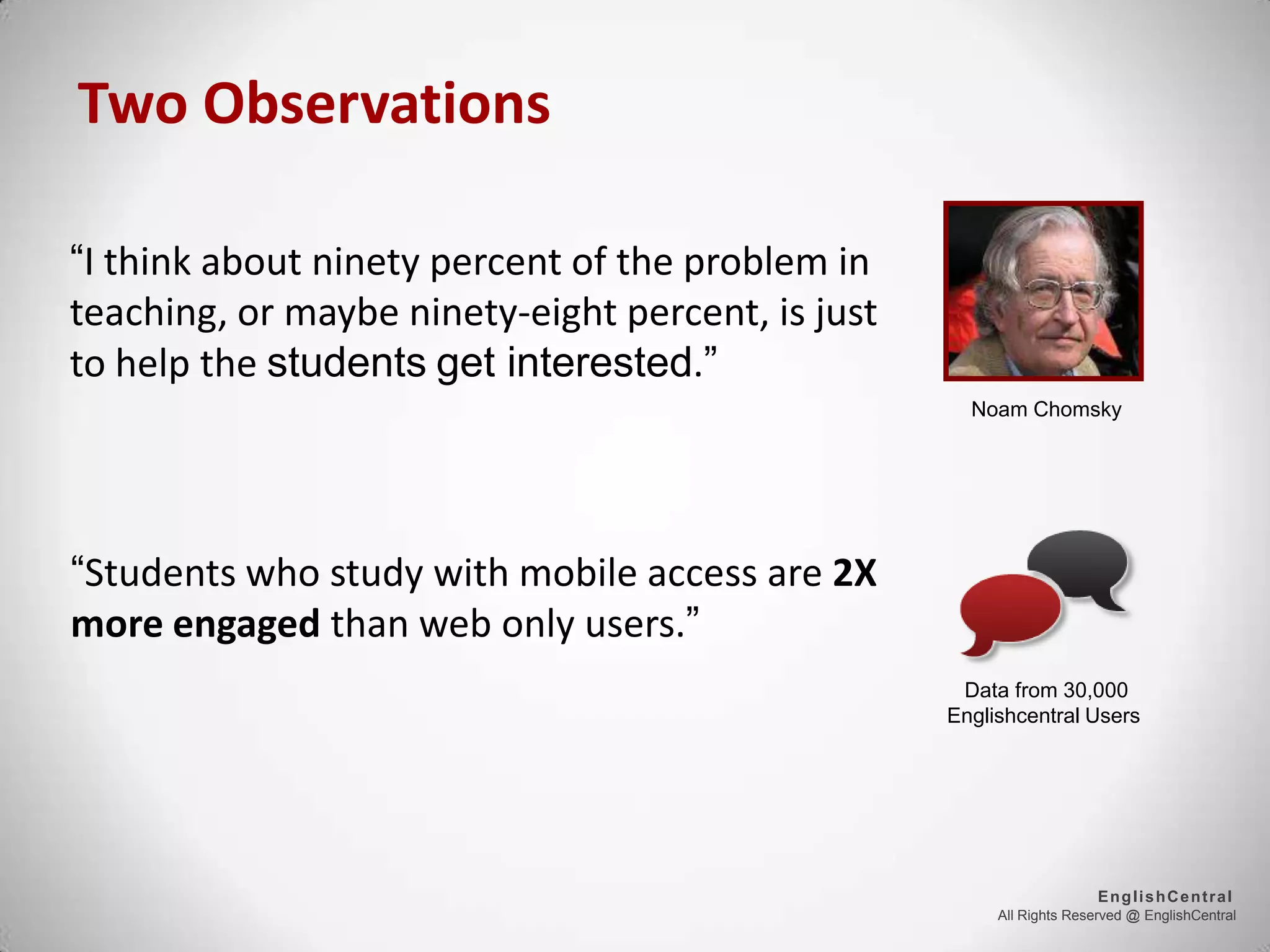 The document discusses how providing access to English learning materials across mobile and web platforms increases student engagement and motivation. It notes that EnglishCentral users who study with mobile access are twice as engaged as those only using web. Mobile access is key to engagement since the penetration rate of smartphones among Japanese university students is 94%, and 16.3% use language learning apps on their phones. EnglishCentral allows students to watch videos, learn vocabulary in context, practice speaking on microphones, and take quizzes across devices to track their progress.