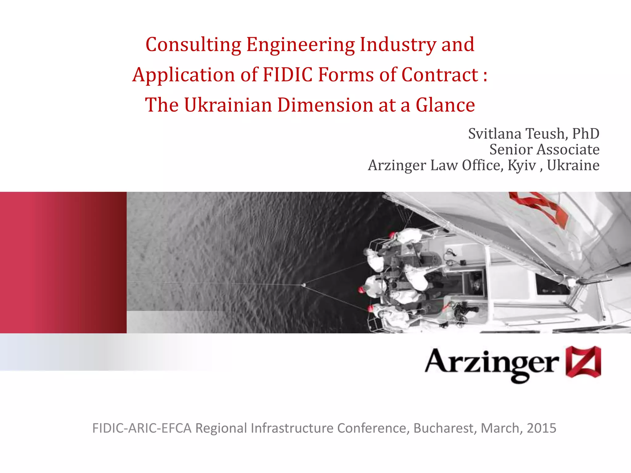 This document discusses the consulting engineering industry and use of FIDIC forms of contract in Ukraine. It notes that while a handful of firms are capable of meeting FIDIC standards, there are issues with qualifications, expertise, and awareness. FIDIC forms see limited use driven by international lenders, with the Red and Yellow Books most common. There is a lack of guidance, case law precedents, and an established operational environment. Challenges include understanding risk allocation, resolving disputes, and developing the consulting engineering industry and contract management culture in Ukraine.